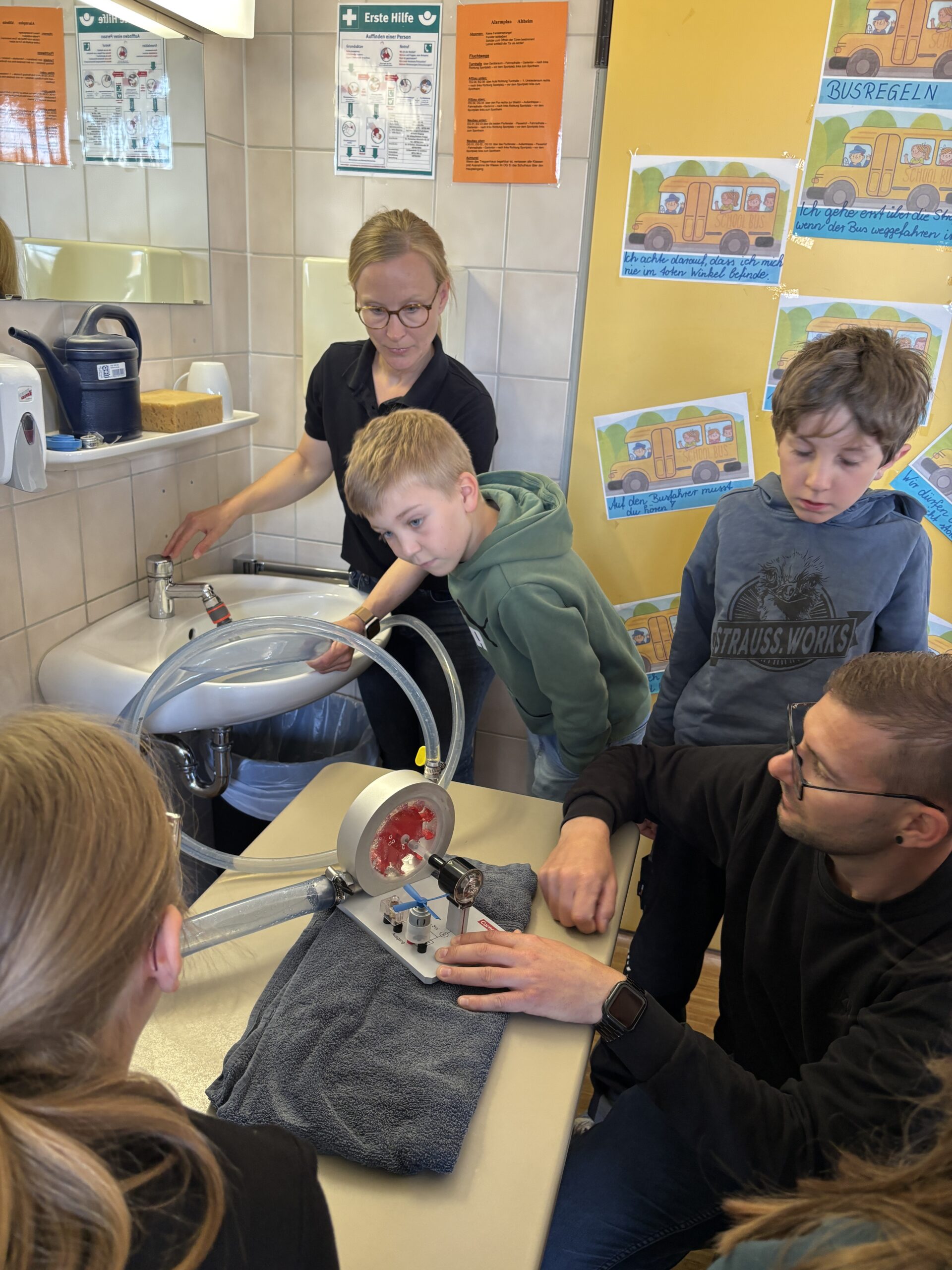Zur Vorbereitung des Besuchs des Wasserkraftwerks in Niederviehbach zeigten Tobias Beckerbauer und Therese Kerl an einem Modell den Kindern die Funktionsweise eines Kraftwerks. Das Modell wurde mit Wasser betrieben, über ein transparentes Sichtfenster konnten die Kinder Turbine, Generator und Welle beobachten.