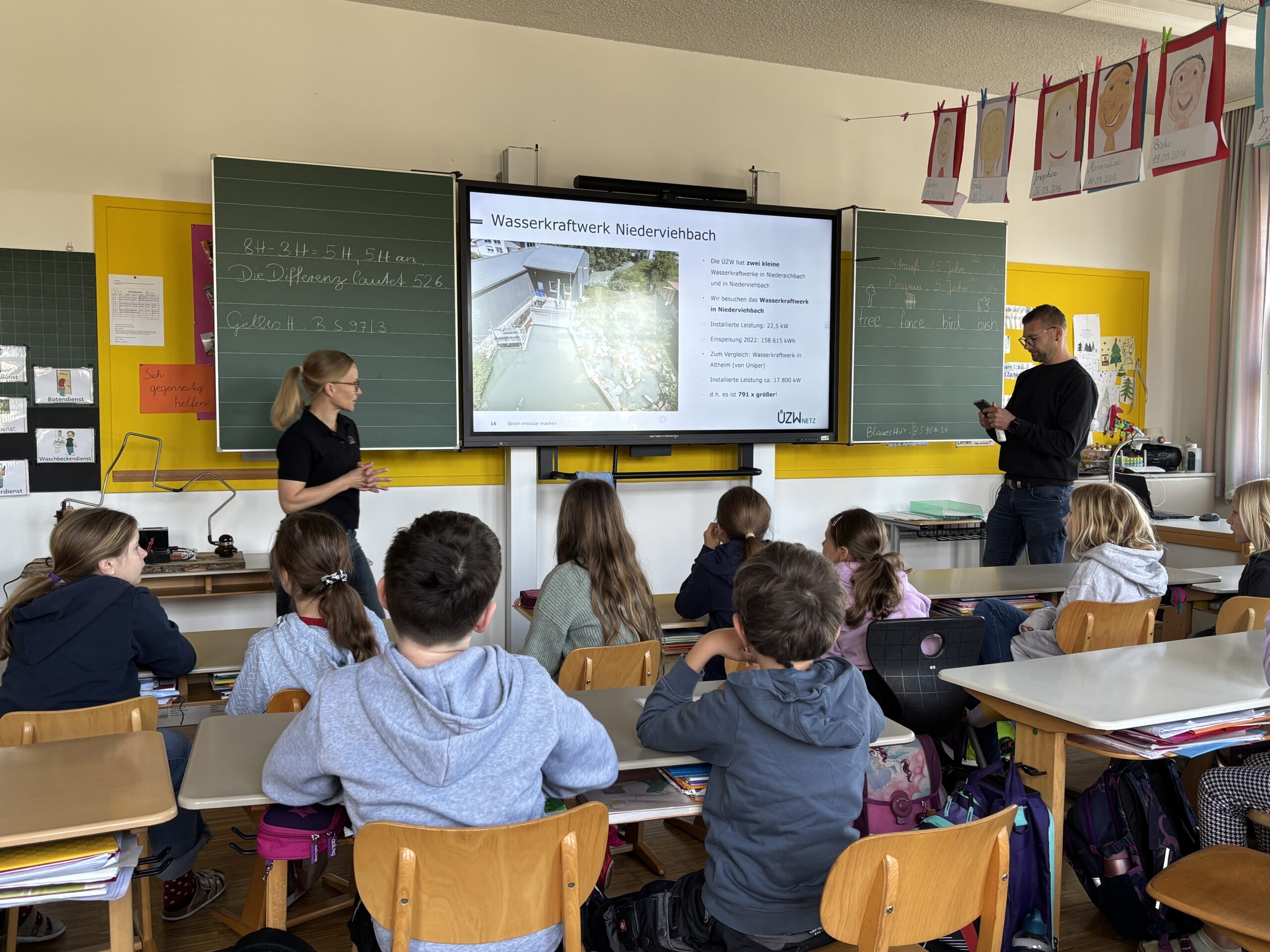 In jeweils zwei Schulstunden drehte sich bei den insgesamt rund 100 Grundschulkindern alles um das Thema Strom und Stromerzeugung. Woraus wird Energie gewonnen? Wie kommt der Strom ins Haus? Worauf muss man beim Umgang mit Strom achten? Diese und weitere Fragen beantworteten Tobias Beckerbauer, Elektromeister bei der ÜZW Netz, und Therese Kerl, Verantwortliche für den Stromvertrieb Gewerbekunden der ÜZW Energie. Die Kinder erhielten so die Chance, sich aktiv mit Themen wie Energieerzeugung und Stromeinsparung auseinanderzusetzen.