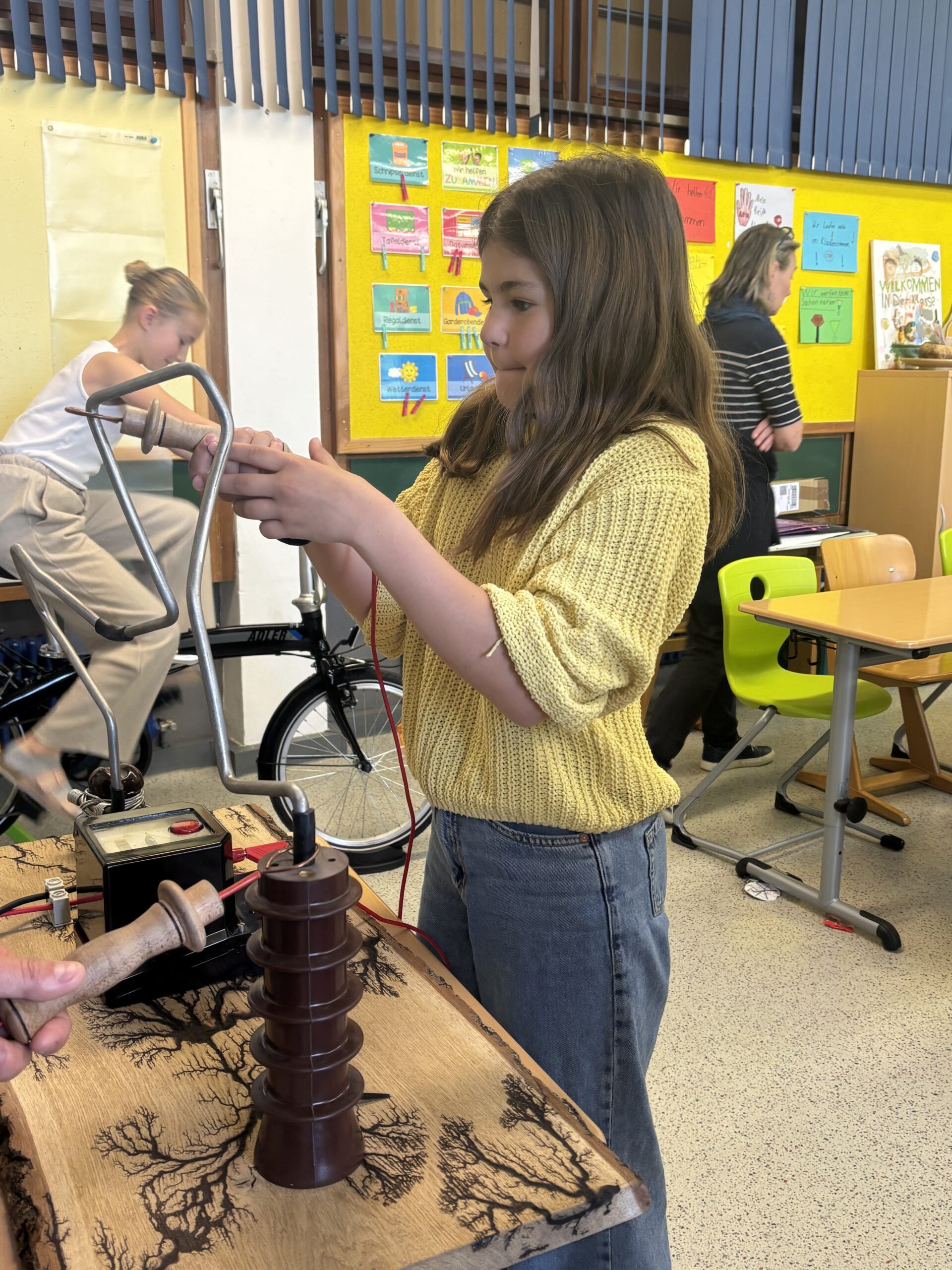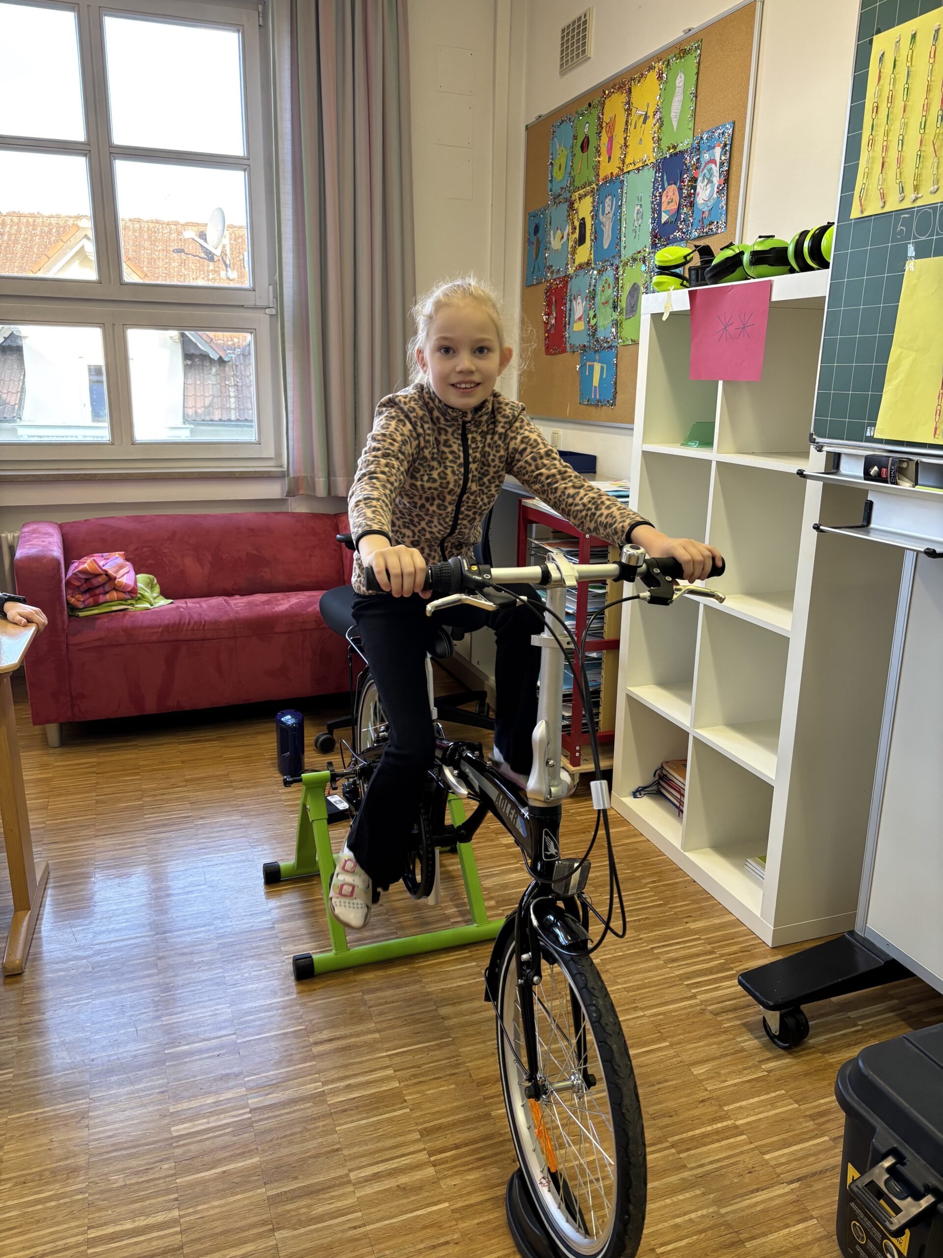 Die beiden ÜZW Mitarbeiter brachten praktische Experimente mit, die das Thema Strom fassbarer machten. Damit die Kinder ein Gefühl dafür bekommen, wieviel Energie und Muskelkraft eingesetzt werden muss, um ein Gerät mit Strom betreiben zu können, durften sie auf einem Rad Strom für einen Wasserkocher erzeugen. Das Rad war an einem Generator angeschlossen. Die spannende Frage: Schaffen es die Kinder, am Ende der Schulstunde ihrer Lehrerin eine Tasse Tee zu kochen?